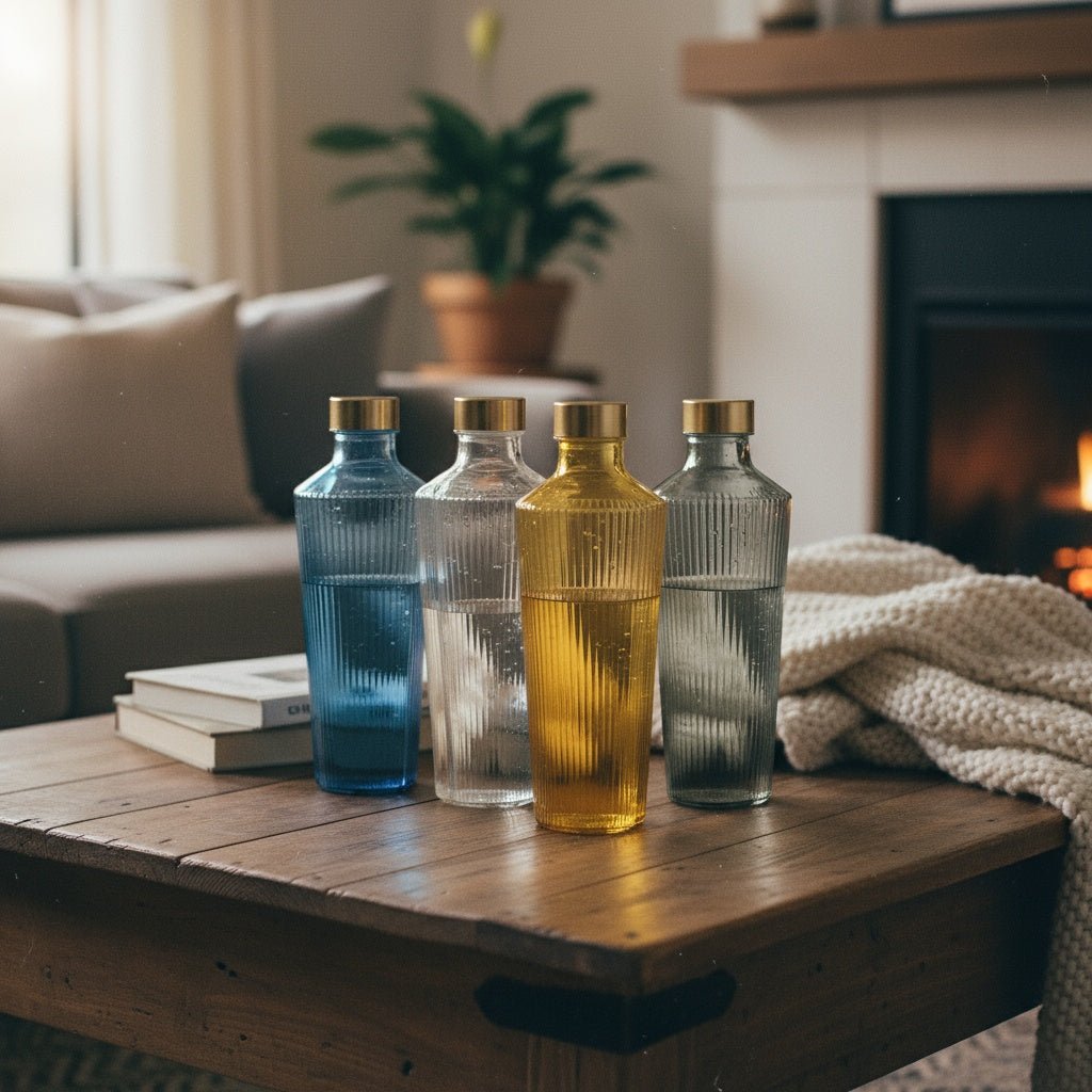 Die mundgeblasenen Flaschen Handy sind in vier Farben erhältlich: Royalblau, Grau, Amber und Transparent. Wähle deine Lieblingsfarbe oder kombiniere mehrere Flaschen für einen harmonischen, individuellen Stil.