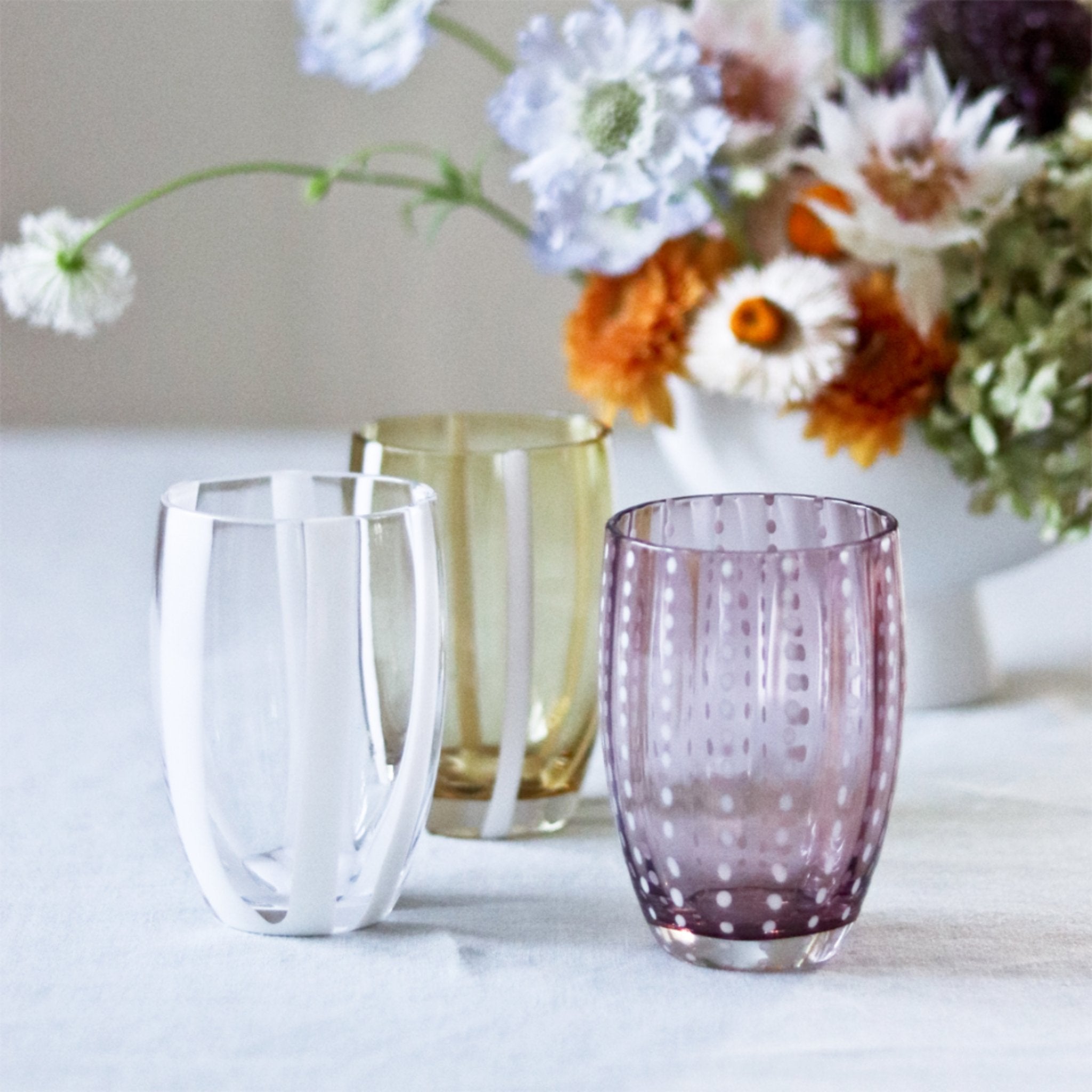 Handgefertigte Trinkgläser Gessato von Federico de Majo für Zafferano entworfen, eignen sich ausgezeichnet für Wasser, Softdrinks und andere Arten von Getränken. Die Trinkgläser sind optimale farbige Begleiter bei Tisch und Umtrunk.