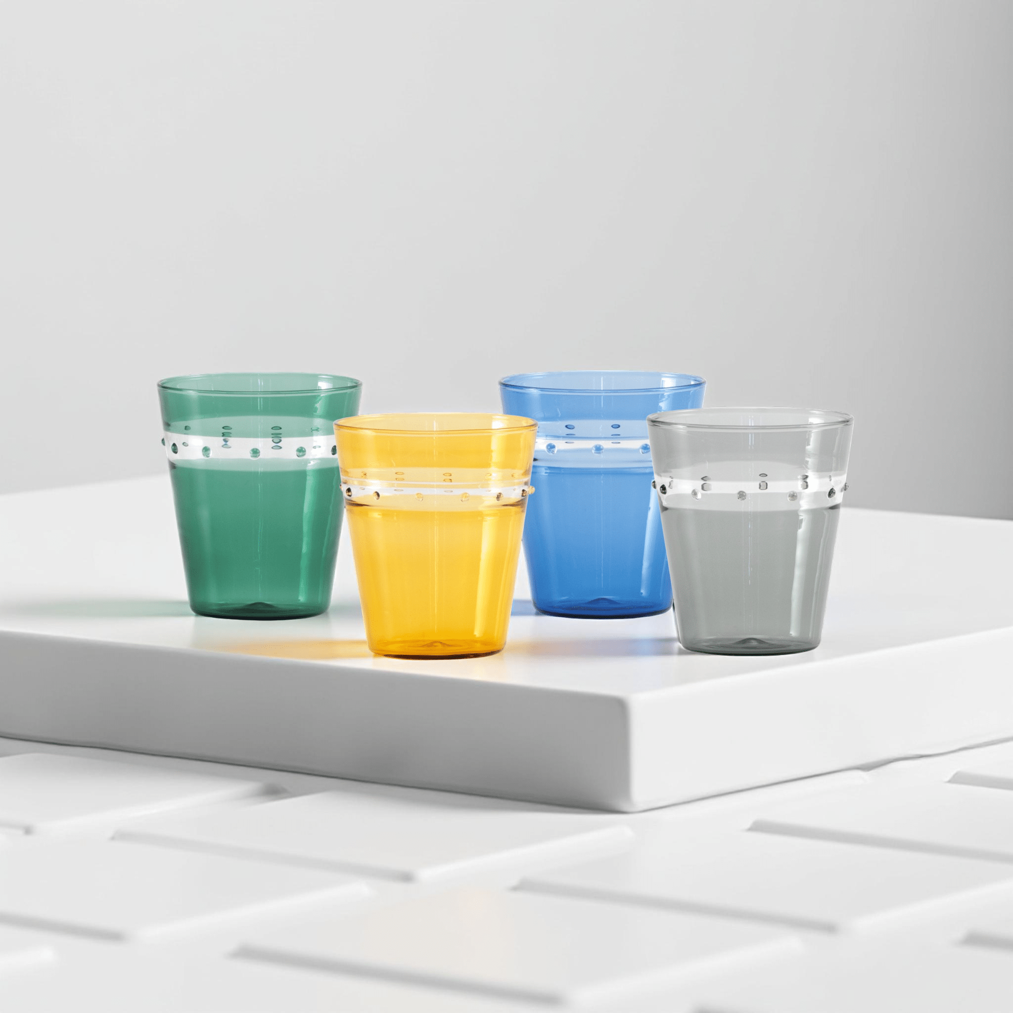 Jedes Glas ist ein Unikat und in vier edlen Farben erhältlich: zartes Hellblau, warmes Goldgelb, stilvolles Grau und erfrischendes Lagunengrün. Die harmonisch abgestimmten Farbtöne machen es zum stilvollen Begleiter für jede Tafel, ob im Alltag oder zu besonderen Anlässen.