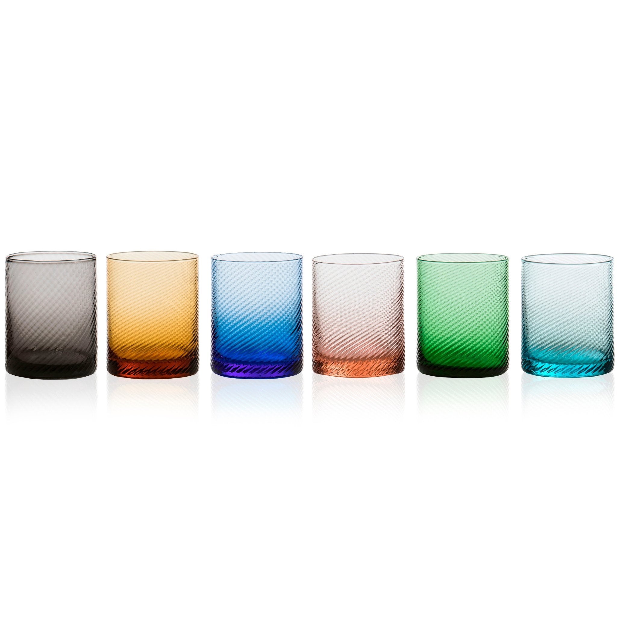 Bei ist eine Kollektion von Gläsern mit funkelnden Farben und tausend einzigartigen Reflexen: Das „Flying Hand“ – Verfahren bedeutet, dass jedes Glas nicht perfekt mit dem anderen identisch ist, was jedes Stück unnachahmlich macht.